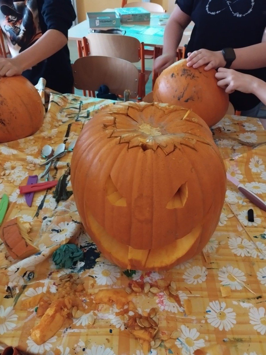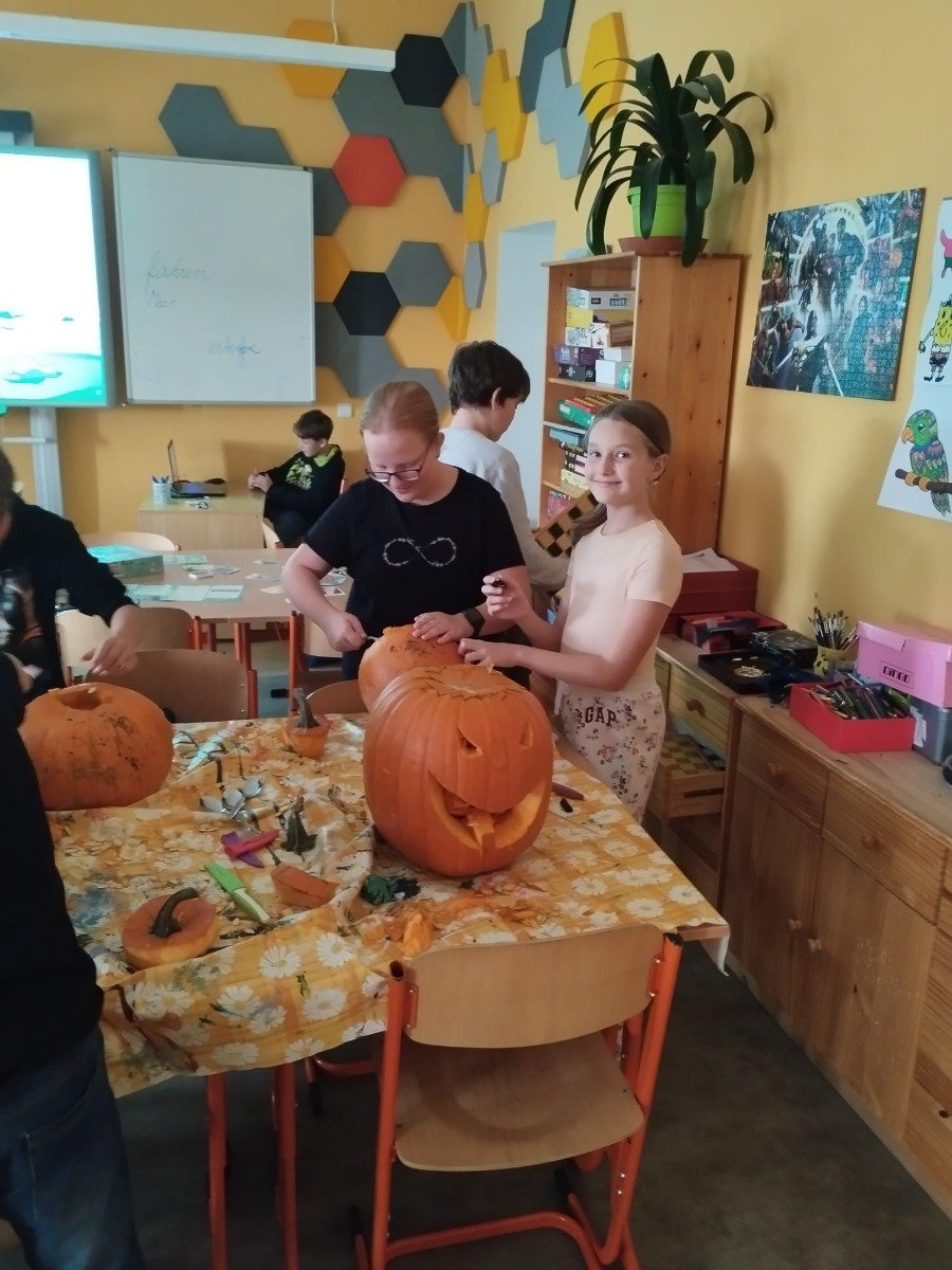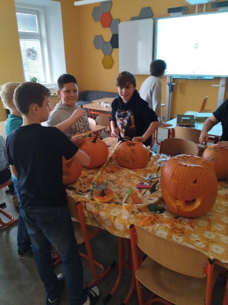 Byla to velká zábava – smáli jsme se, tvořili, dlabali, řezali, vykrajovali i ochutnávali a nakonec jsme dýněmi vyzdobili vstup do staré školy.