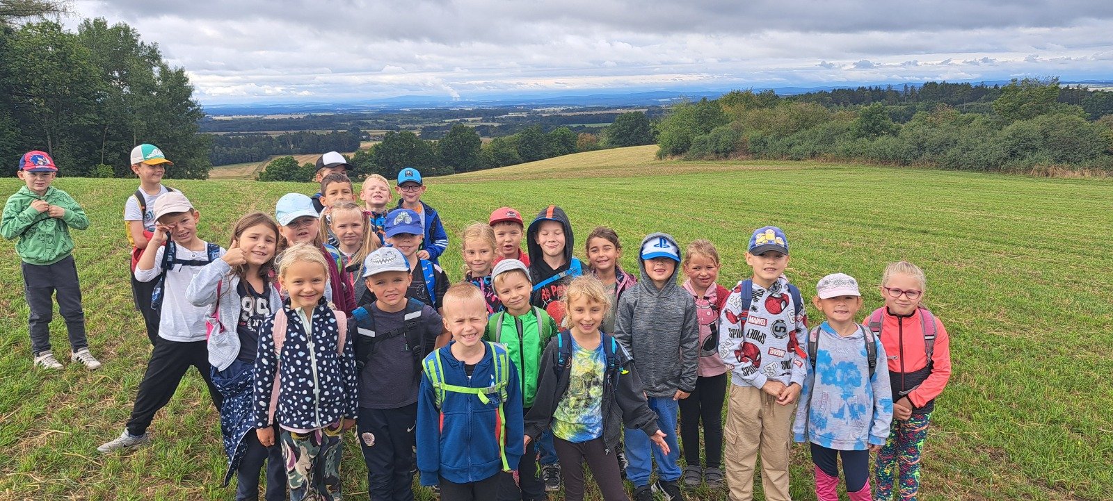 V pátek 5.9. se naši nejmladší žáci z 1.A a 1.B vydali na svůj první společný pochod. Cílem byla blízká Hůrka, kam děti dorazily s dobrou náladou a spoustou energie. Na Hůrce si pohrály, nasvačily a užily si chvíle společně stráveného času mimo školní lavice. Počasí nám přálo a děti zvládly trasu s úsměvem.