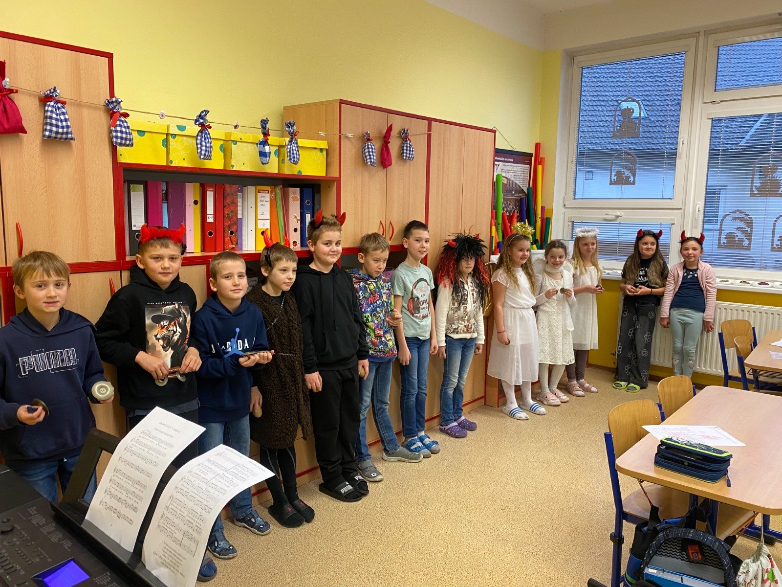 V pátek 5. 12. zavítali do všech tříd naší školy deváťáci přestrojeni za Mikuláše, anděly a čerty. Děti od rána s napětím očekávaly jejich příchod. Setkání v naší třídě se jako každý rok neobešlo bez několika čertovských písniček nebo sladkostí od milých andílků či kousků uhlí od strašidelných pekelníků.
