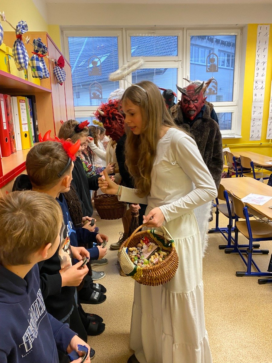 V pátek 5. prosince, jako každý rok, přišli na 1. stupeň deváťáci v maskách Mikuláše, andělů a čertů. Druháci jim zazpívali, zatančili a přednesli čertovskou báseň. Za to dostali sladkou odměnu a někteří také kousky uhlí.